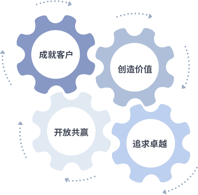 成就客户是一切决策的出发点,,,创造价值是衡量所有工作的标准,,,,追求卓越是我们做事做人的态度,,,开放共赢是我们的格局也是最终的结果。。价值观的齿轮环环相扣,,,,推动着组织里的每个人不断向前。。。