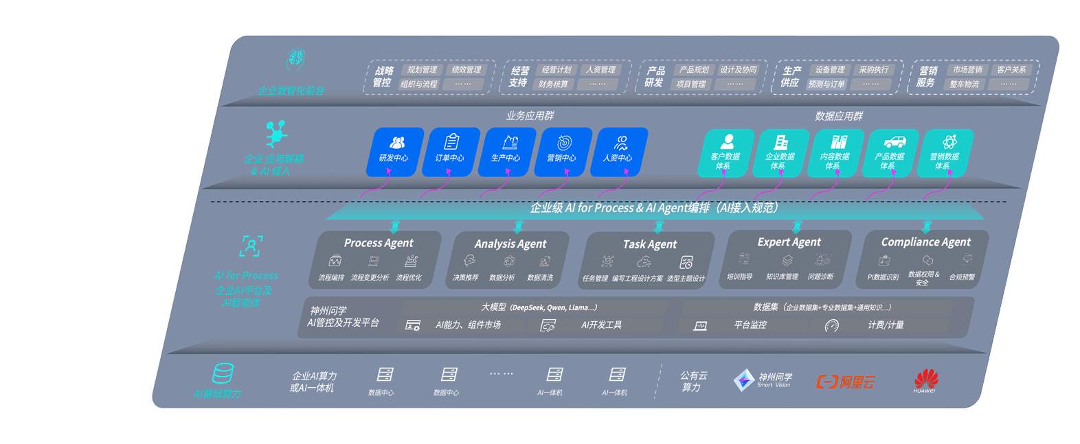 端到端的一站式AI工作空间深度融合了从企业战略规划到日常经营的全流程业务板块,,,,定向解决车企内部领域多、、、部门多、、、、链条长、、场景碎片化等难题,,,支持车企快速构建以AI为核心的生产力写作体系,,实现任务执行与AI能力的无缝集成与交互
