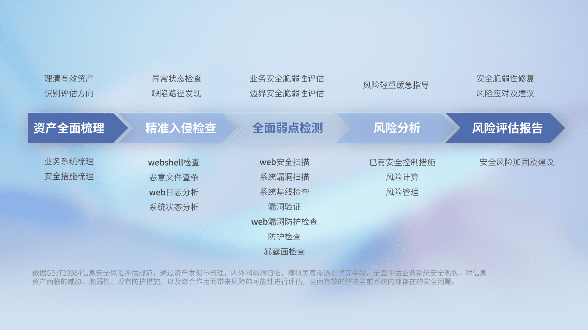 针对客户行业特性,,,,以专业的安全服务+多厂商联合解决方案提供专属的一站式安全管理服务,,,帮助客户全面感知网络空间威胁,,,,基于识别、、、检测、、分析、、防护、、、监测、、、、响应的服务理论模型,,,,从方案咨询、、集成交付、、评估验证、、优化加固、、、运维运营,,致力于为客户提供完整的闭环管理式安全服务。。以实战经验为客户打造高抵御风险的安全体系,,,帮助客户发现威胁、、、对抗威胁、、、、处置威胁,,不断积累安全对抗能力,,,,持续保障数字化安全。。。