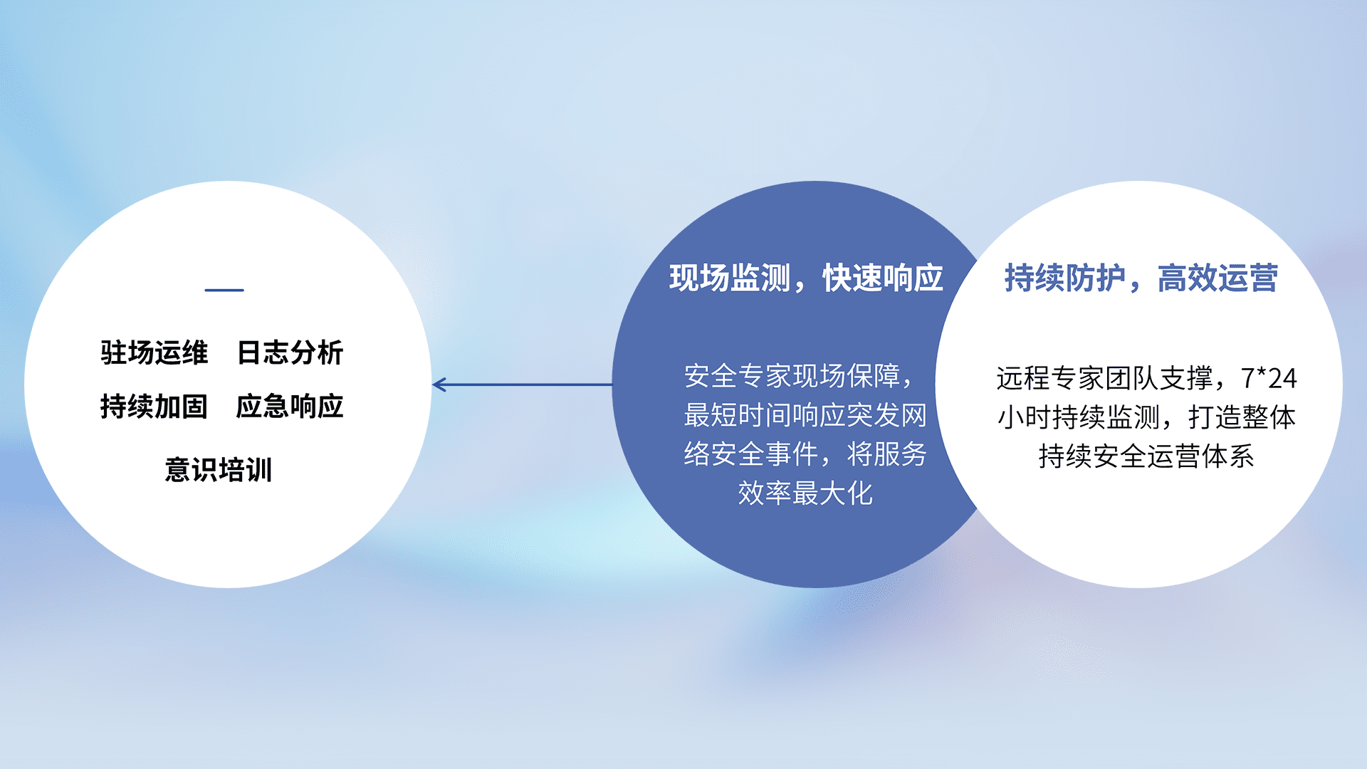 针对客户行业特性,,提供专属的一站式安全管理服务,,,,帮助客户全面感知网络空间威胁,,,,通过安全专家的线上、、、、线下防护支持,,,,实现风险闭环,,,将安全保障常态化,,,为客户打造常态化安全运维运营服务。。